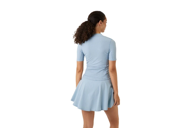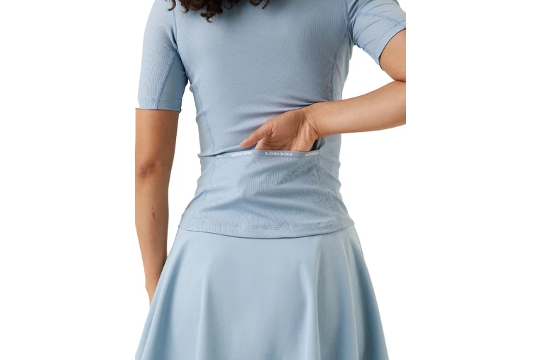 Het Björn Borg Ace Rib T-Shirt is een klassiek en comfortabel tennisshirt met korte mouwen van zachte gerecyclede polyamide met stretch. Dit slim-fit model heeft een licht opstaande ronde hals, iets langere mouwen voor een elegante look en een handige zak op de onderrug voor je tennisballen. Het logostiksel op de heup zorgt voor een kenmerkende finishing touch. Het model is 173 cm lang en draagt maat S.