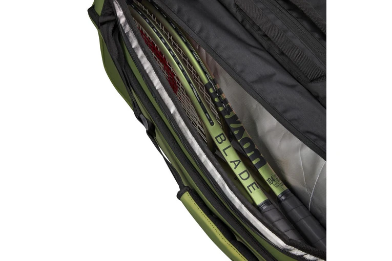 Defined by rich, dynamic design and best-in-class functionality for tennis players, the Blade Super Tour Collection turns heads for good reason. The Super Tour 15 Pack has a plethora of features, highlighted by Thermoguard lining in two main racket compartments to protect against extreme heat. Other features include a zippered shoe pocket with ventilation, a dual carrying system for convenient transportation and ample space for up to 15 tennis rackets and additional personal effects. Bag complements Blade v8 tennis rackets, making this a perfect option for any and all Blade fans.
